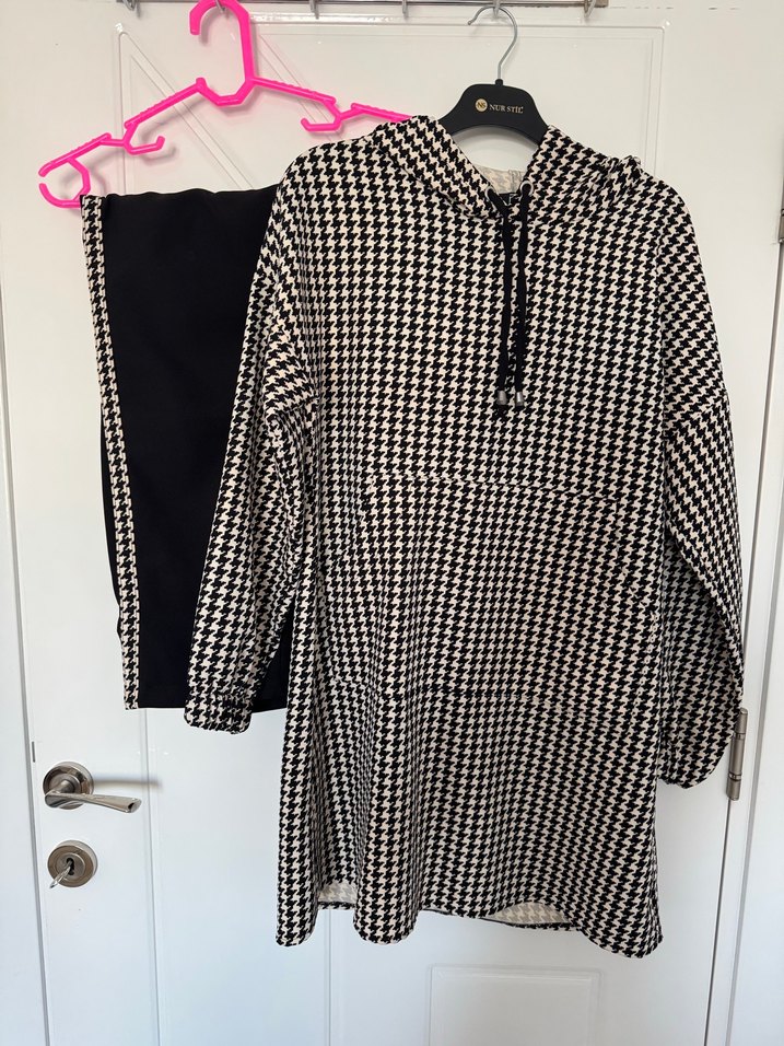Kadınlar için kapüşonlu, uzun kollu, siyah beyaz kazayağı desenli üst ve siyah pantolondan oluşan takım. Düğmeli, regular fit, sentetik kumaştan, günlük kullanım için uygundur.