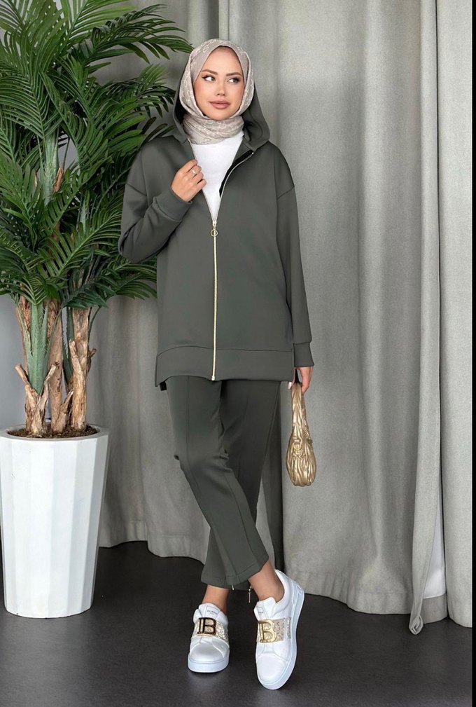Kadın Kapüşonlu skuba kumaş Kemerli Haki Eşofman Takımı