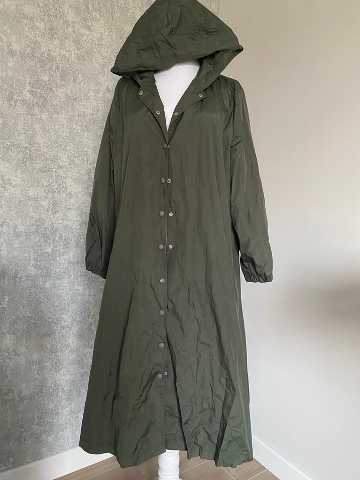 Kadınlar için uzun, kapüşonlu haki yağmurluk. Düğmeli, bol kesim ve sentetik kumaştan üretilmiştir. Uzun kollu ve notlu yaka detayı bulunur. ️