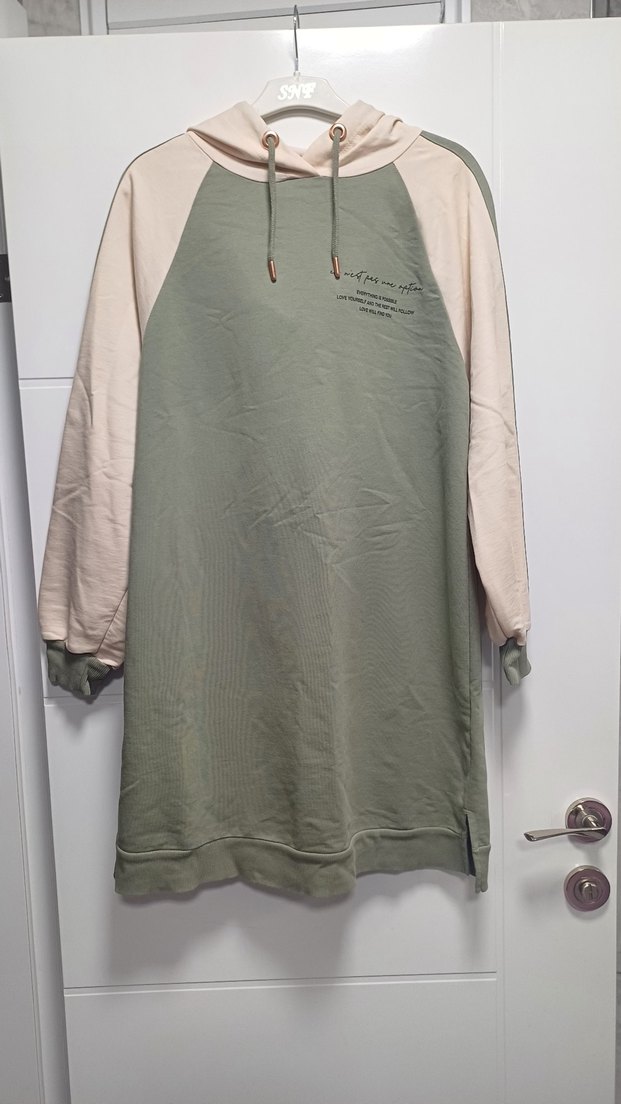 Kadınlar için uzun kollu, yuvarlak yakalı, salaş kesim ve drapeli tasarıma sahip pastel haki renk sweatshirt. Yumuşak sentetik kumaştan, baskılı detaylı, rahat sokak stili için uygundur. Tunik boyu 87 cm dir.