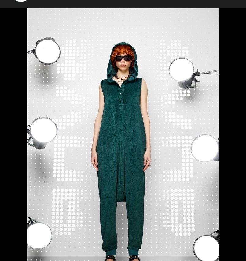 Bu kolsuz, kadın tulumu, yumuşak yeşil kumaşla rahat kesim ve uzun boy özelliklerine sahiptir. Kapüşon ve düğme detaylarıyla şık bir sokak stili sunar.