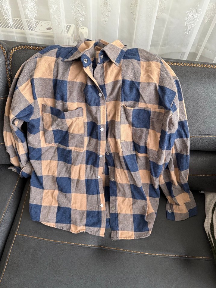 Bol kesim, uzun kollu, düğmeli kadın gömleği. Kahverengi ve gri kareli desende, yumuşak dokulu kumaştan üretilmiştir. Günlük sokak stili için uygundur.