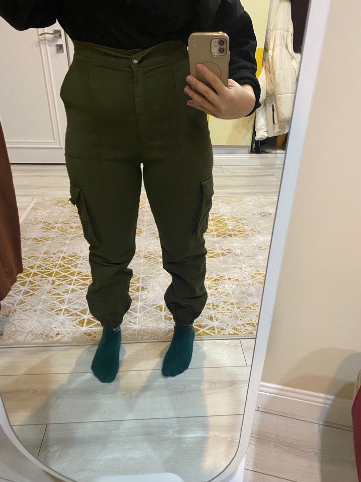Lastikli yüksek bel bol kesim haki kargo pantolon. sentetik kumaştan üretilmiştir. Günlük sokak stiline uygundur. 2 kere kullanıldı tertemiz