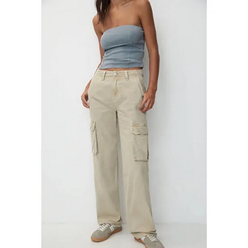 Bol kesim, bej haki kargo pantolon, yan cep detayıyla, günlük rahat kullanım için uygun.