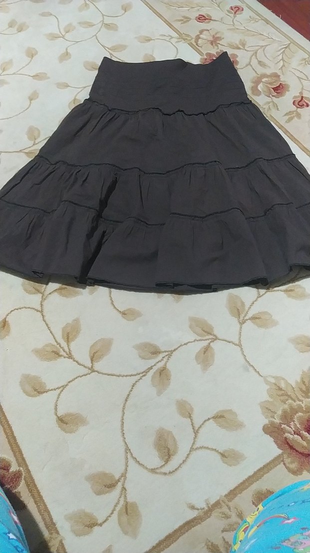 Sentetik kumaştan yapılmış, kat kat fırfırlı, bol kesim koyu kahverengi kadın eteği. Gotik ve avangart tarzlara uygun. Temiz sağlam az kullanılmış.