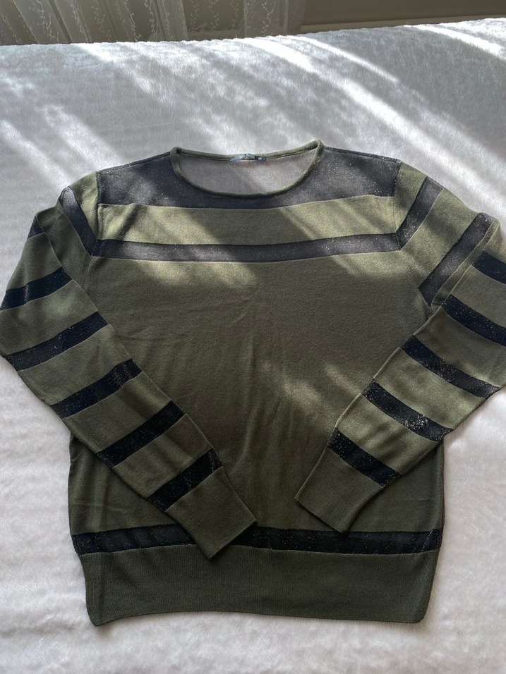 Boyu 58 cm iki kol arası en 54 cm Hiçbir deformesi yoktur özenli kullanılmıştır tüylenme yoktur Yeşil renkli, gri çizgili, örgü kadın kazak. Uzun kollu, yuvarlak yaka ve salaş kesim, günlük rahat kullanım için uygundur.