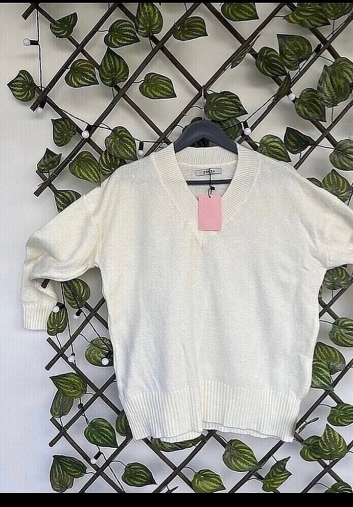 Beyaz örgü pamuk kazak, salaş kesim, uzun kollu ve V yakalıdır. Kısa boy ve deseniz, günlük sokak stiline uygundur.