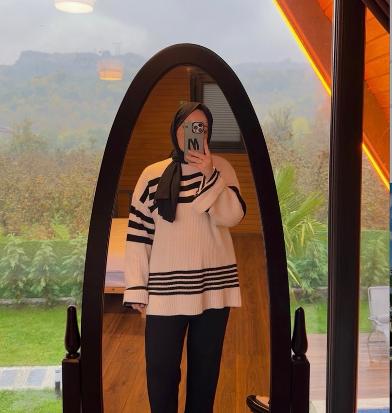 Camel renginde, yüksek yakalı uzun kollu yün kazak. Zebra desenli, bol kesim ve örgü dokulu, rahat sokak stili için uygundur.