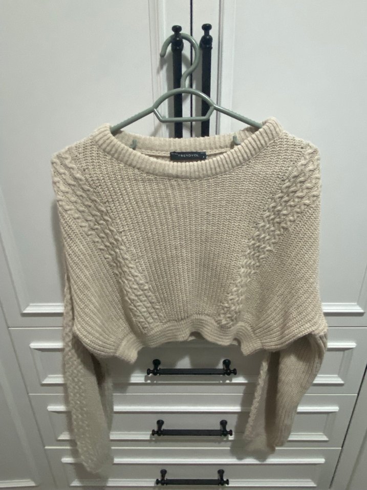 Bej renkli, örgü kumaştan, uzun kollu, yuvarlak yakalı, bol kesim, midi uzunlukta, sade tasarımlı kadın triko kazak. Rahat ve günlük kullanıma uygun.