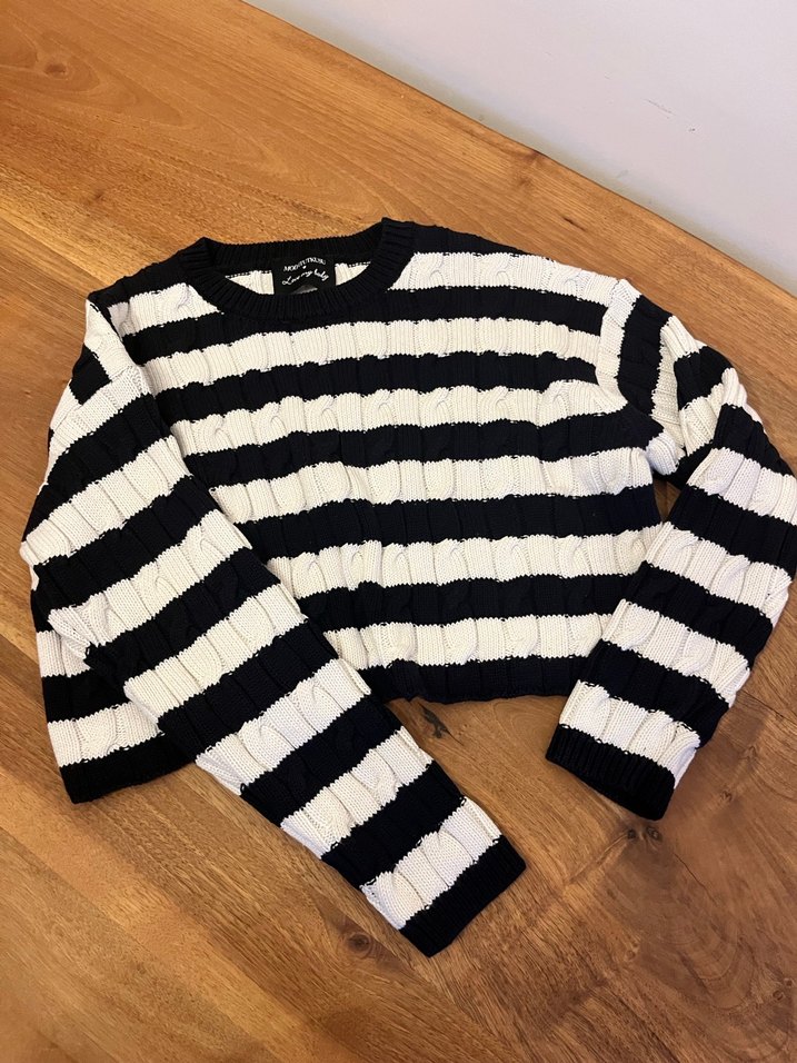 Kadın kazak, örgü yapıda uzun kollu ve bisiklet yaka olarak tasarlanmıştır. Bol kesim ve normal midi boyda, sıcak yün malzemeden üretilmiştir. Koyu renkli çizgili deseniyle trend sokak tarzını yansıtır. Sırt detayı ayrı güzel Üç defa giyildi Adıl ışık moda turkusu koleksiyonu özel tasarımıdır