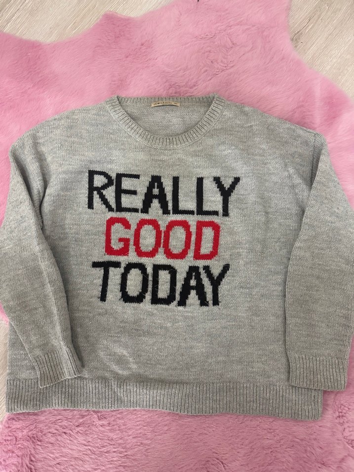 Gri renkli, uzun kollu, yuvarlak yaka örme kadın kazak. Ön kısmında "REALLY GOOD TODAY" yazısı baskılıdır. Salaş kesim ve midi boyda, günlük rahat stil için uygundur.