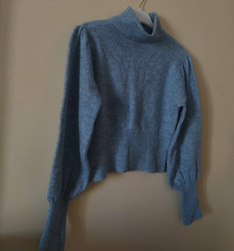 Gri renkli, yüksek yakalı ve uzun kollu örgü kadın kazak. Salaş kesimi ve midi boyu ile rahat ve günlük kullanıma uygundur.İyi durumda.S-M bedene uyumlu.
