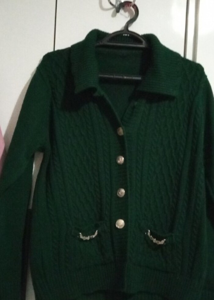 S/M uyumlu zümrüt yeşili kazak Bı tane üstten bı tane alttan düğmesi yok onun dışında kusursuz