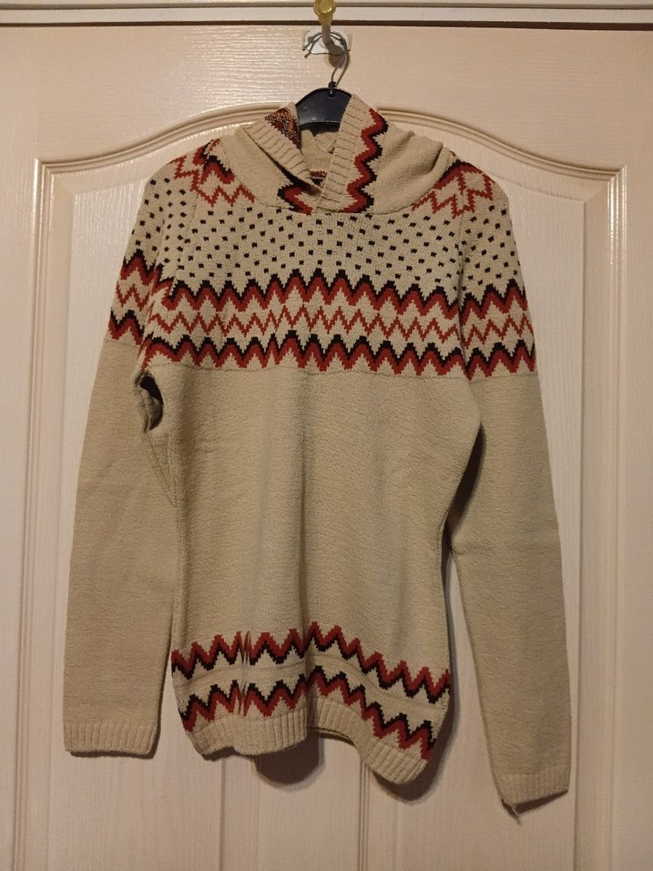 merhaba kadın kazak örgü detaylı kapüşonlu yeni etiketli ürün, 38 bedene uyumlu, beden mezura ölçüsü iki kol arası 43 cm ,boy uzunluğu 59 cm ,kol boyu 56 cm ,yünü yumuşacık dokuma triko.