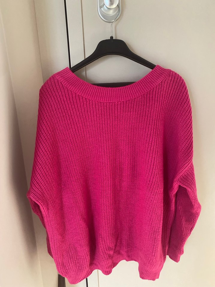 Pembe renkli, yuvarlak yaka ve uzun kollu örgü kazak. Salaş kesimiyle rahat ve renkli bir günlük sokak stili tercihidir.
