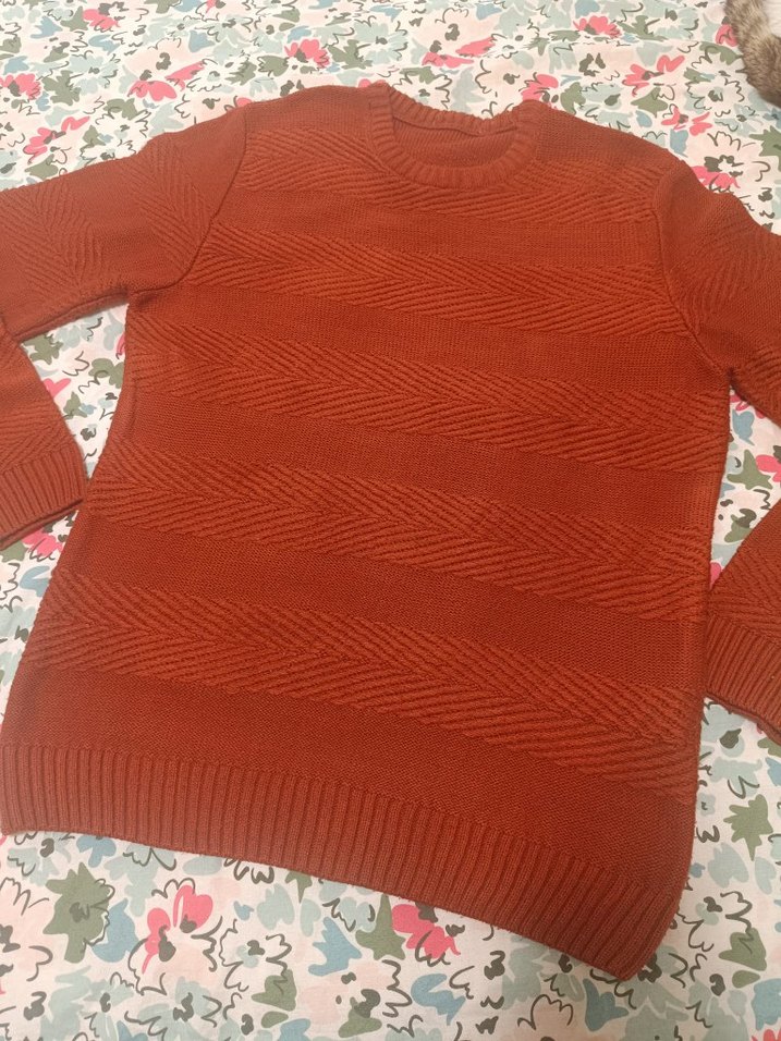kiremit rengi triko kazak, yuvarlak yaka ve uzun kolludur. Bohem tarzı ve rahat dokusuyla günlük kullanıma uygundur.