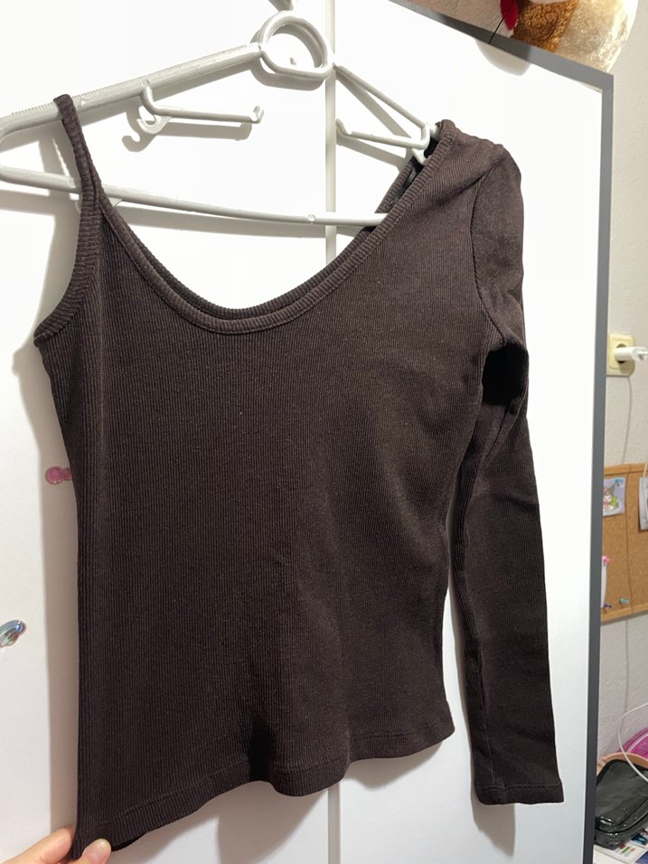 Kahverengi kadın tek kol omuz detaylı fitilli bluz kazak sorunsuz