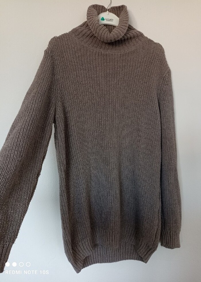 Kadın kazak tunik esnektir uzunluğu 80 cm iki göğüs arası ölçüsü 60 cm dir balon kol acık kahve gri koyusu gibi rengi