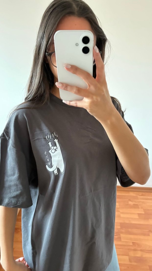 Pamuk kumaştan, kısa kollu ve salaş kesim gri kadın tişörtü. Önünde baskılı desen bulunur, günlük rahat giyim için uygundur. Farklı renk ve bedenleri mevcuttur.