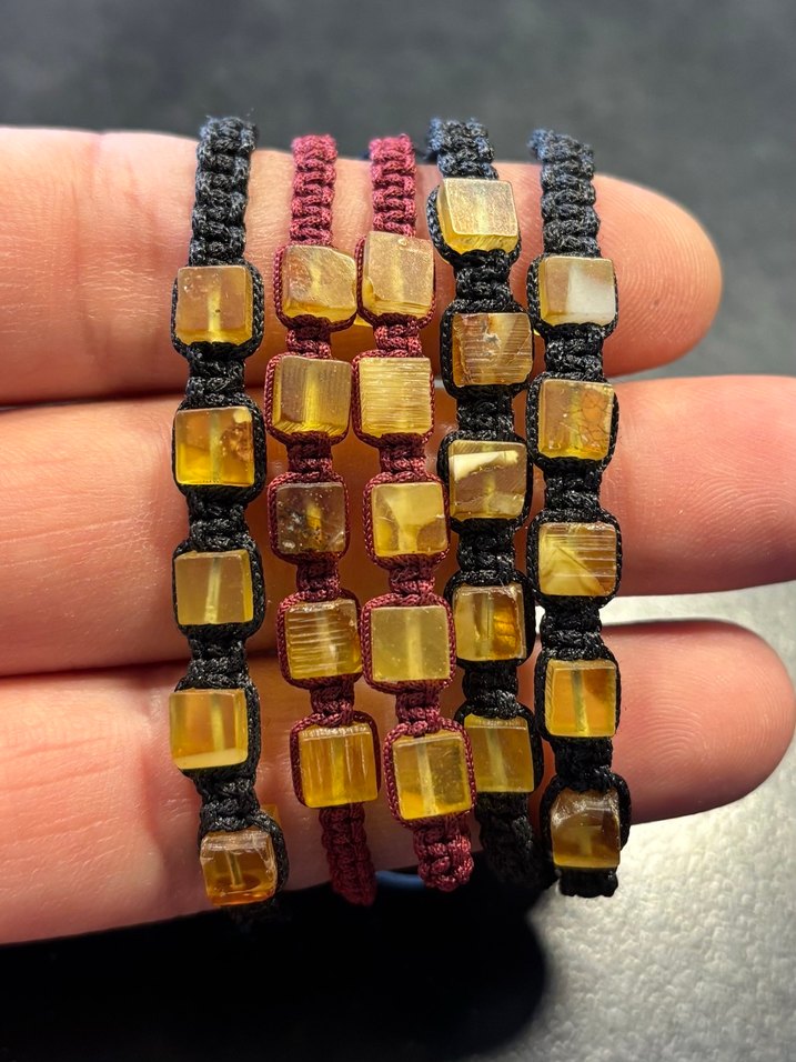 ADET FİYATIDIR… Altın renkli desenli taşlar ve koyu renk örgü iplerle bezenmiş, günlük kullanıma uygun Kehribar kadın bileklikleri.