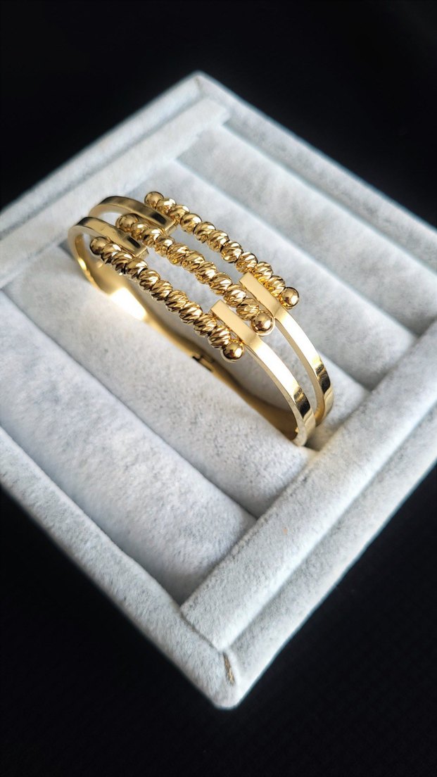 Altın renkli, parlak yüzeyli ve boncuk detaylı kadın bilezik