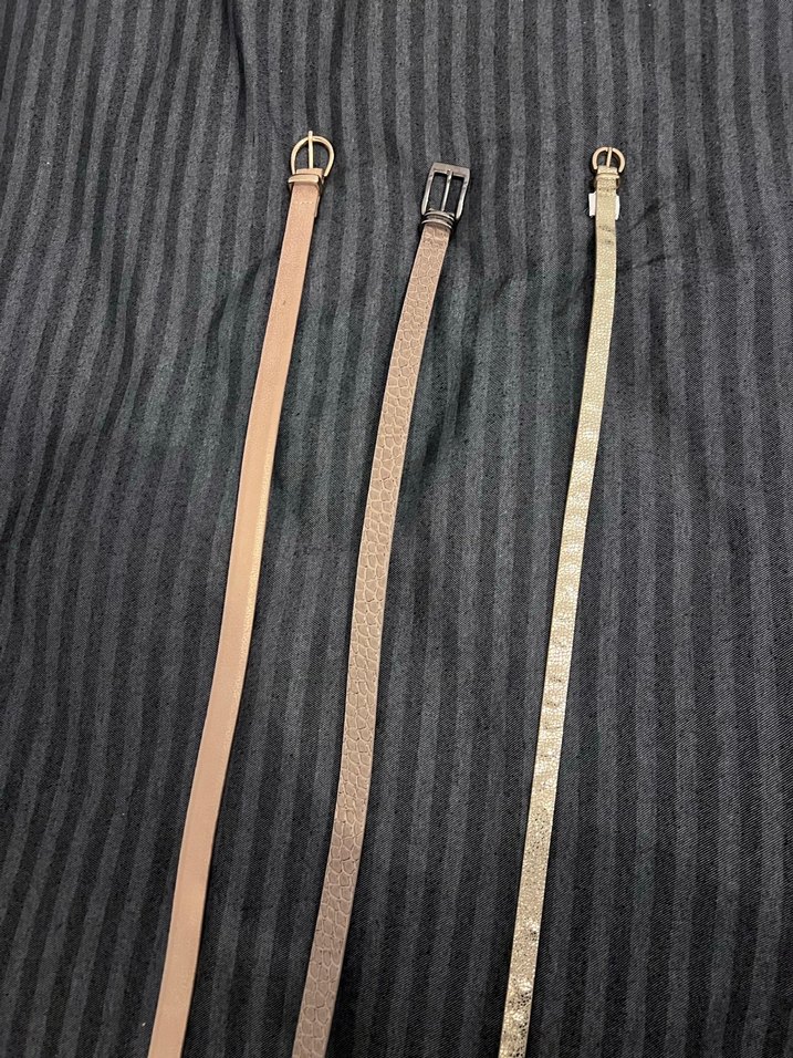 Soldaki parlak, süet ve pudra ile krem arası bir renk. Ortadaki sütlü kahve renginde, rugan ve desenli. En sağdaki gold, ince ve parlak.