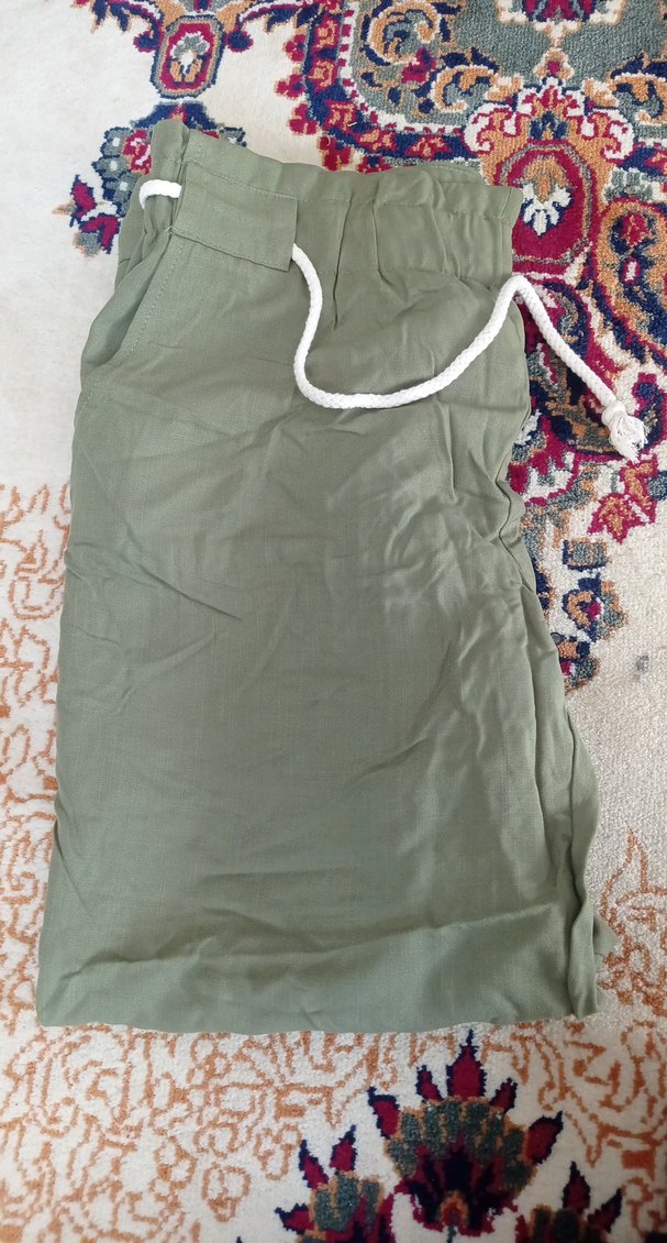 Kadınlar için kemerli bol kesim uzun pantolonlar, yumuşak sentetik kumaştan ve haki renginde. Günlük kullanım için bohem tarzını yansıtıyor.