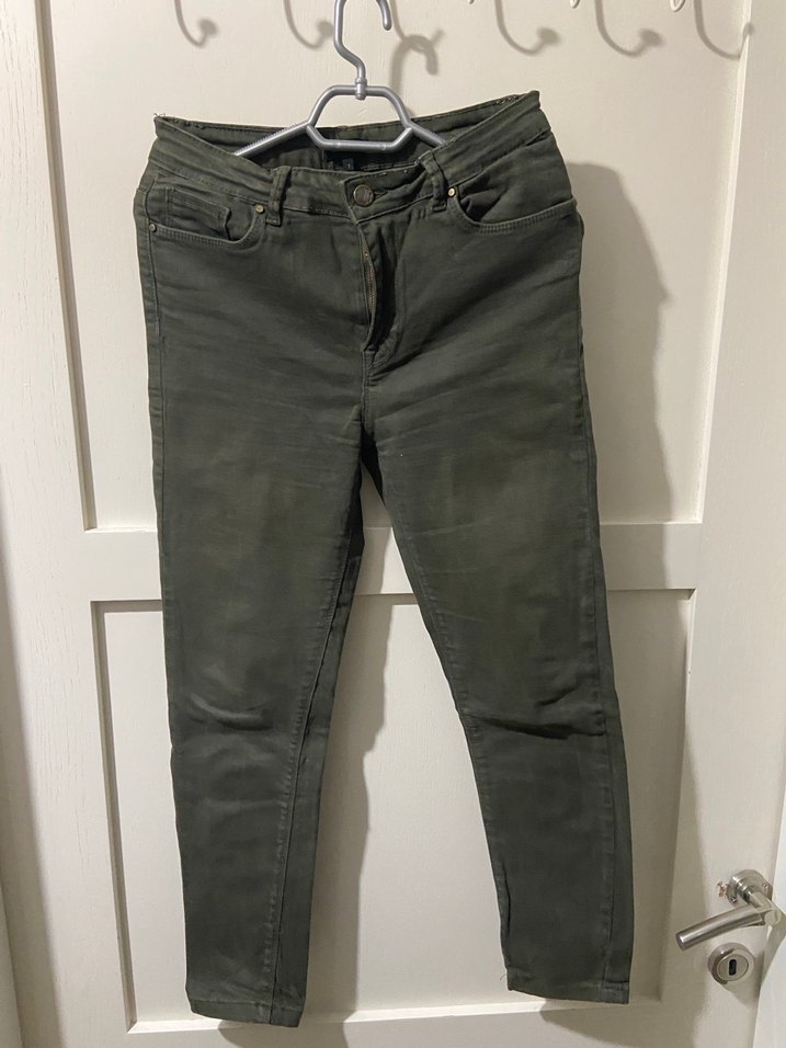Kemer detaylı, dar kesim haki renk kot pantolon. Günlük kullanım için uygun, sokak stiline uyumlu rahat bir tasarım.