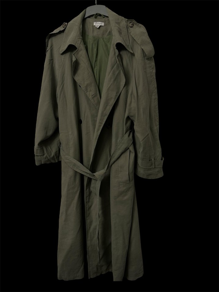 Kadınlar için kemerli, uzun kesim keten trençkot. Koyu haki kamuflaj deseni ve bol kesimiyle günlük sokak stiline uygun.
