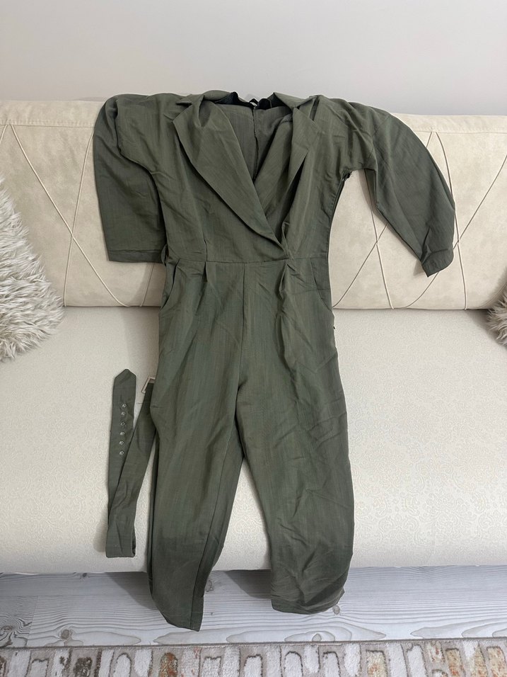 Kadın keten kumaştan, kemerli ve uzun boy tulum. Notlu yaka ve askılı kollara sahip, günlük kullanıma uygun vintage tarzda rahat bir model.
