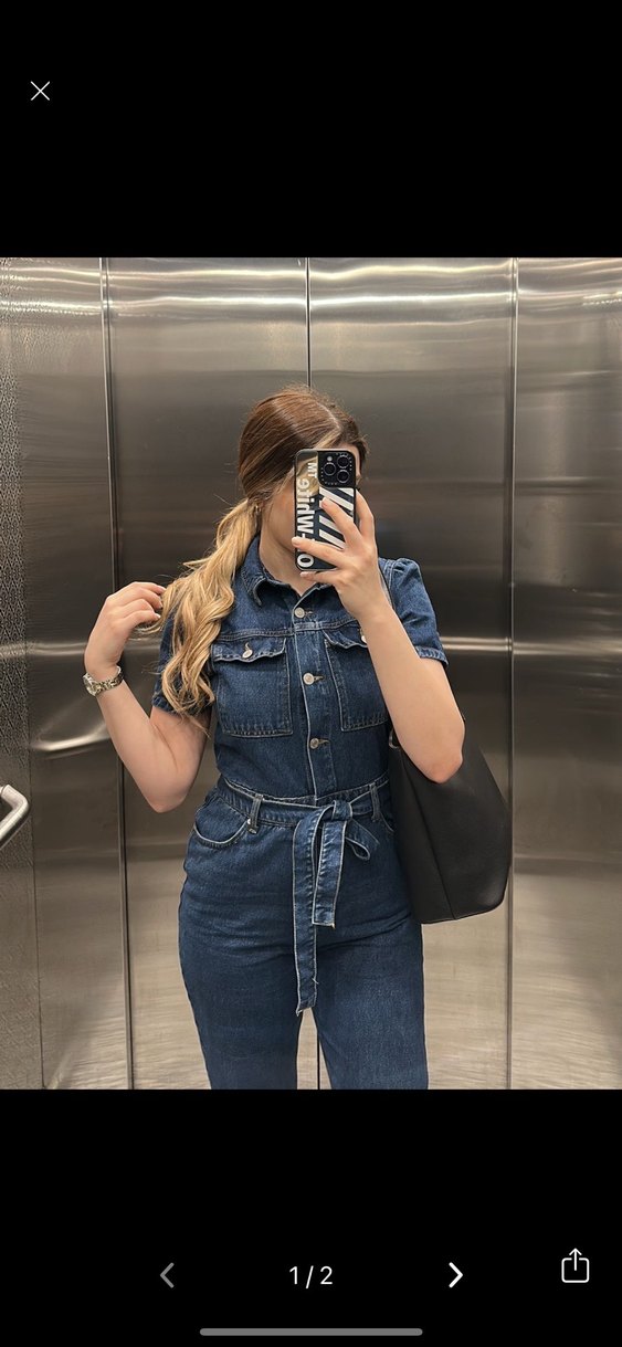 Kemer detaylı, kısa kollu, fitted kesim kadın denim tulum