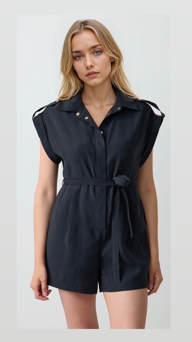Lacivert renkli, yakalı ve kısa kollu bu kısa tulum kemerli olup, bol kesimdir. Sentetik kumaştan yapılmıştır ve günlük rahat stil için uygundur.
