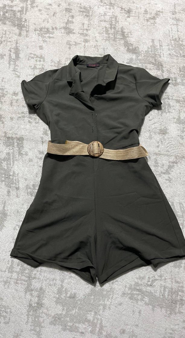 Kadınlar için kemerli, yakalı ve kısa kollu, oturan kesim kısa tulum. Günlük rahat kullanım için uygundur.