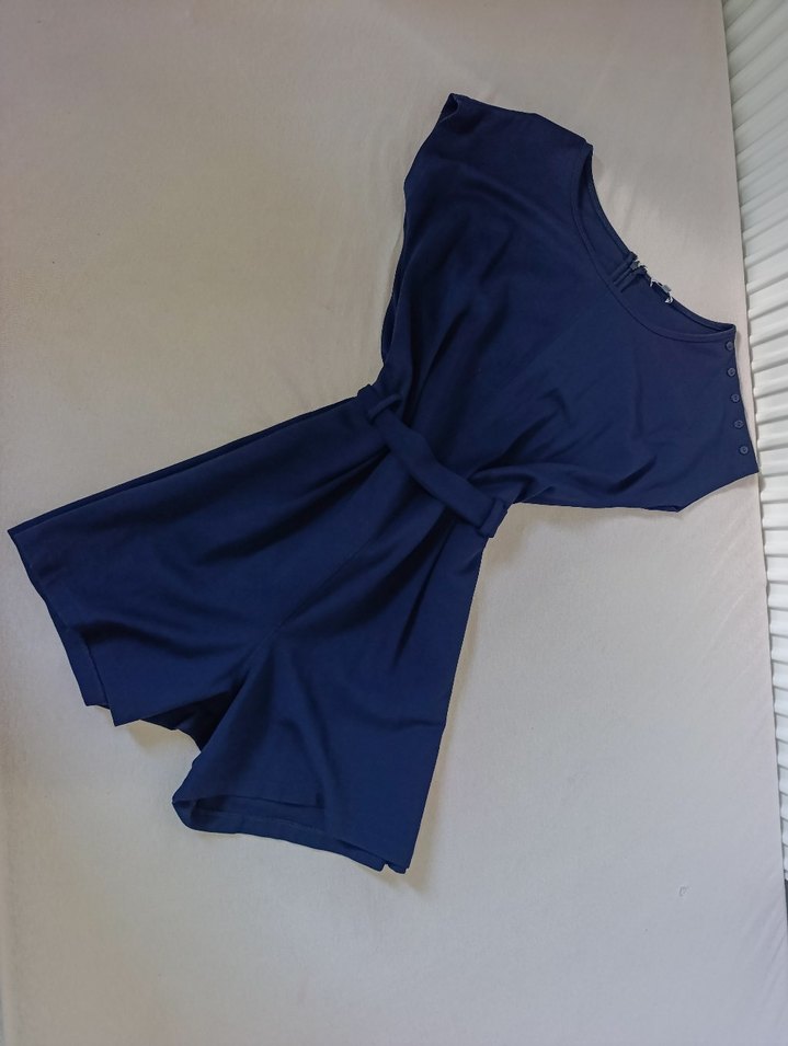Kadınlar için kemerli ve kısa kesim tulum. Sentetik kumaştan yapılmış, canlı mavi renkte ve sokak stili için uygun.