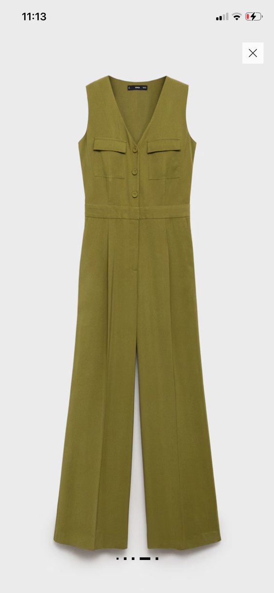 Kolsuz, kemerli, haki renk tulum. Notlu yaka ve düz tasarıma sahip, ofis kullanımı için uygun, sentetik kumaştan üretilmiştir.