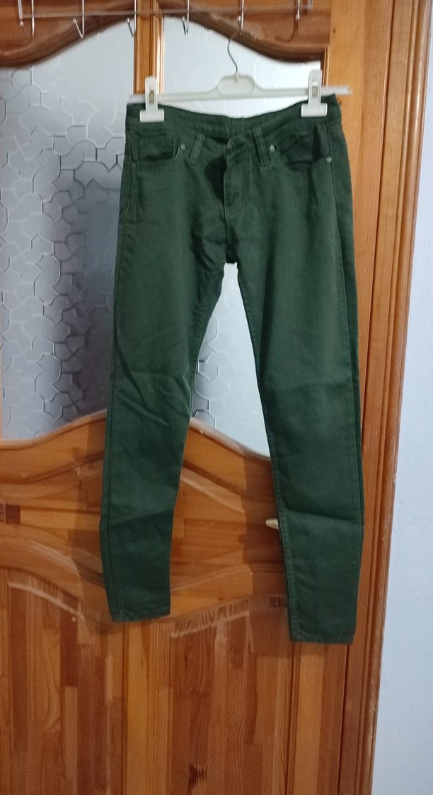 Koyu yeşil renkte, kemerli ve regular fit kadın pantolon