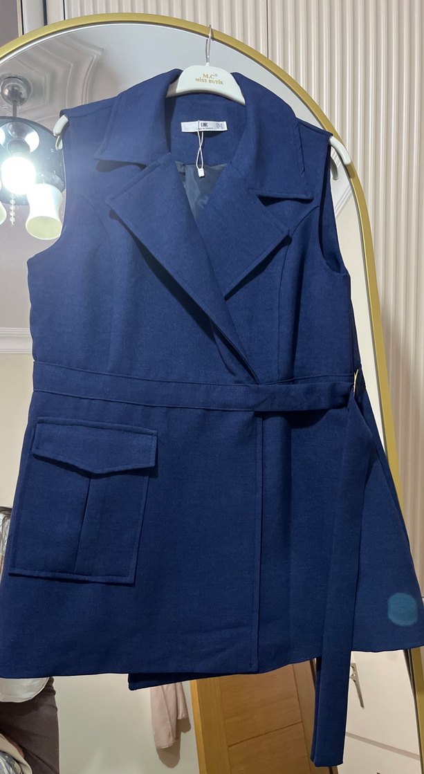 Kemerli, yakalı ve kolsuz lacivert yelek, sentetik kumaştan üretilmiştir. Normal kesim ve midi boydadır, ofis ve günlük şıklık için uygundur. ✨