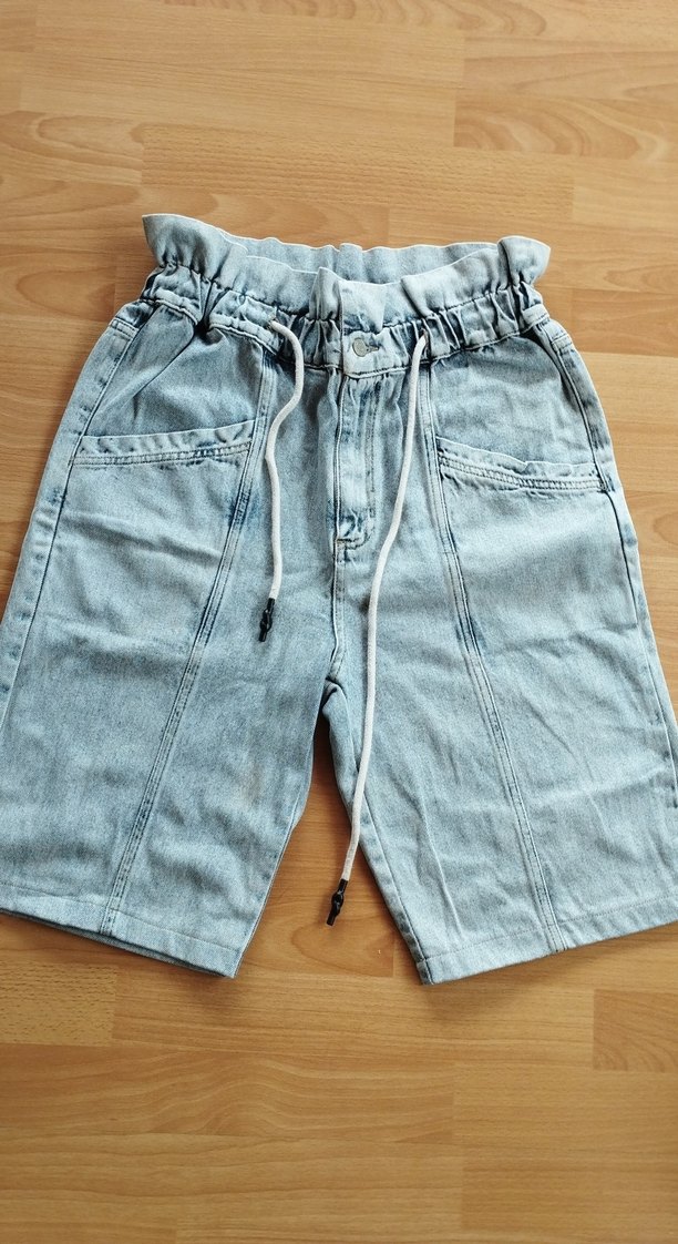 Kadınlar için kemerli, cep detaylı, gevşek kesim pastel mavi tonlarında denim şort. Günlük ve sokak stili için uygundur. M bedene tam olur ama beli lastikli olduğu için her beden tercih edebilir.