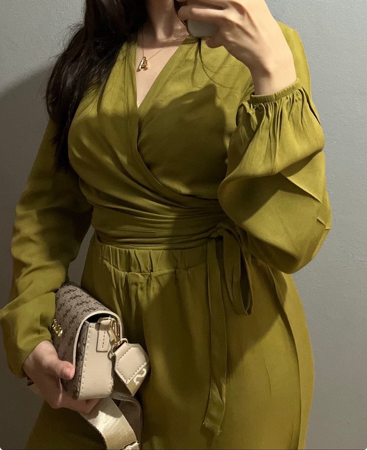 Kemerli, bol kesim haki kumaş takım. İpeksi dokulu, askılı kollar ve straplez yaka ile parlak görünümlü, günlük kullanıma uygun. max 2 kere giyildi Bacak boyunda yanlarda küçük yırtmaçları var Dekolte kısmı ayarlanabilir