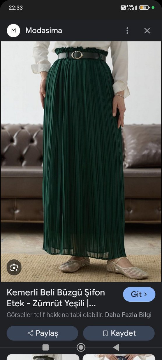 Kemerli, piliseli uzun yeşil etek, sentetik kumaştan, bol kesim. Günlük kullanıma uygun klasik ve çağdaş tarzda.