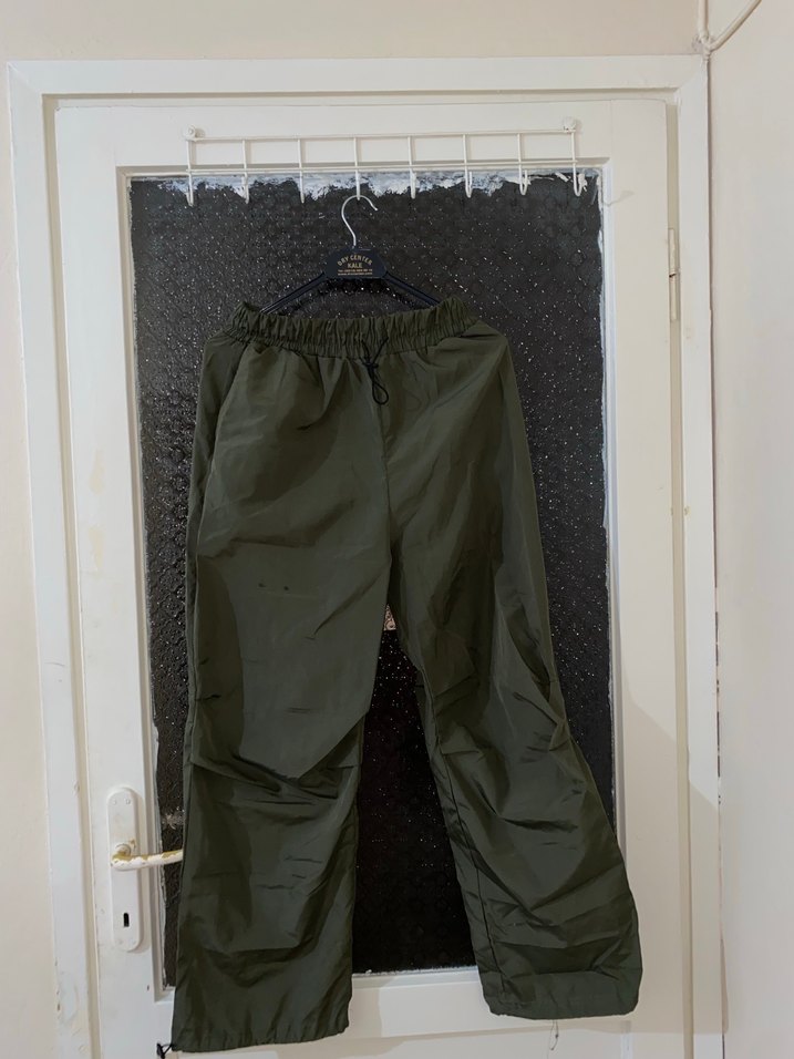 Kemerli beli, midi boy, salaş kesim haki kumaş pantolon. Koyu sentetik kumaştan, dış mekan kullanımına uygun, sokak ve athleisure tarzı için ideal.
