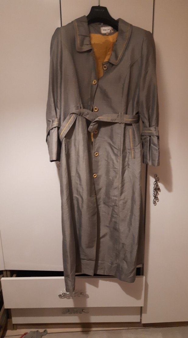 Kadınlar için uzun, kemerli, bej keten kaban. Notlu yaka ve kemerli bel ile düzenli kesim. Askılı kollar ve desensiz, ofis ve sokak modasına uygun. boy 130 santim iki kol arası 51 santim ufak ip çekmeleri mevcut başka problemi yok