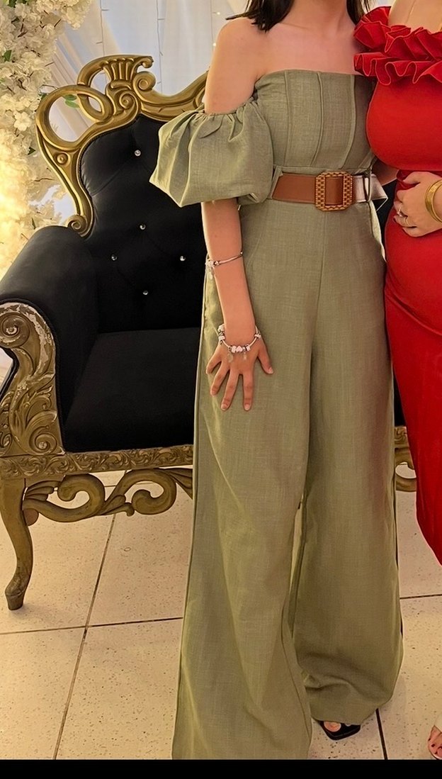 Kadınlar için kemerli, uzun, haki renkli tulumdur. Askılı kolları ve straplez yakasıyla rahat bir kesim sunar. Sentetik kumaştan üretilmiş olup, düğün gibi özel günler için uygundur.