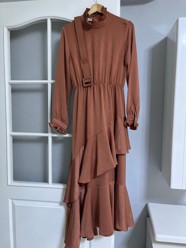 Kadınlar için kemerli, uzun ve bol kesim kahverengi elbise. Yumuşak sentetik kumaş, yüksek yaka ve volanlı kol manşetleriyle günlük kullanıma uygun klasik tarzda.