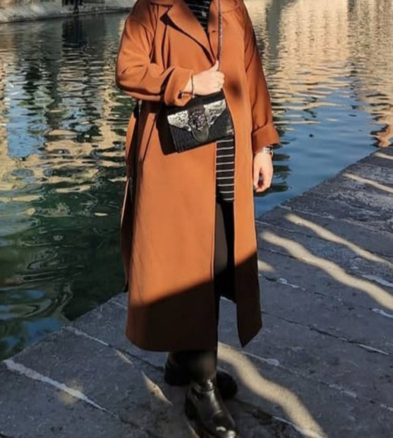 Kadın Kemerli Uzun Taba Kaşe Kaban