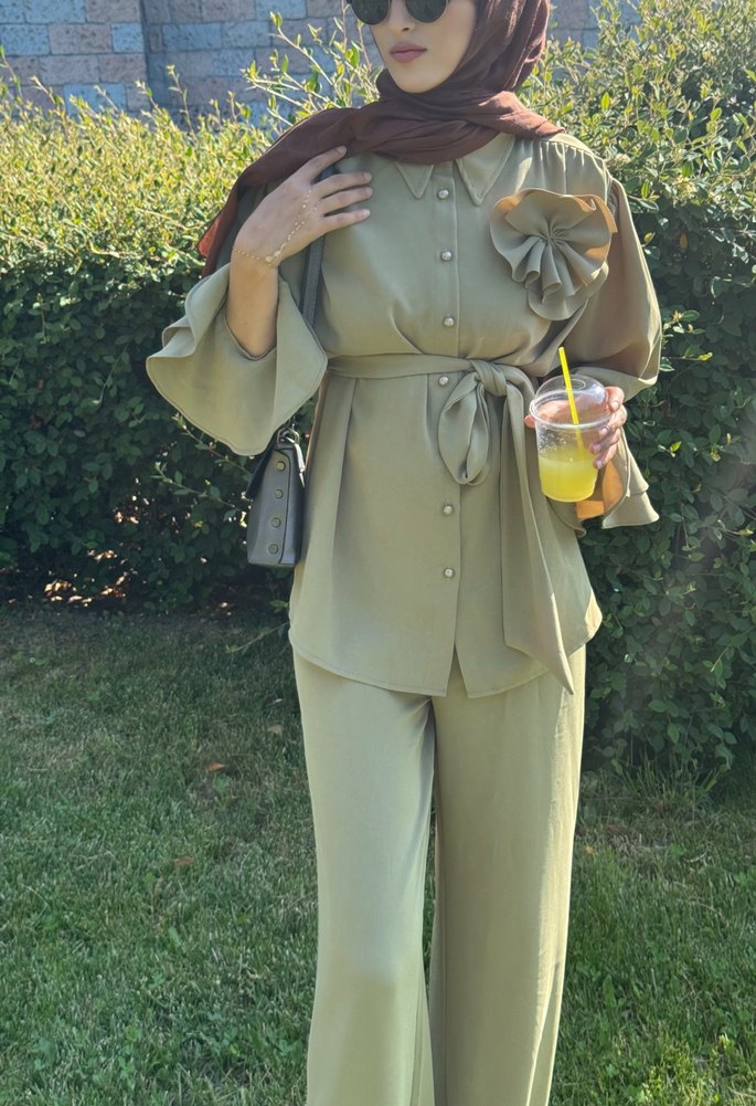 Kadın kemerli, uzun kesim, haki renk takım. Notch yaka, uzun kollu, düz desensiz ve sentetik kumaştan, günlük rahat stil için ideal.