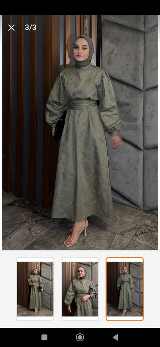Kemerli, yüksek yakalı ve bol kesimli keten kumaştan yapılmış uzun, haki renkte elbise. Uzun askılı kollara ve hafif kamuflaj desenine sahiptir, vintage ve sokak modası stilini birleştirir.
