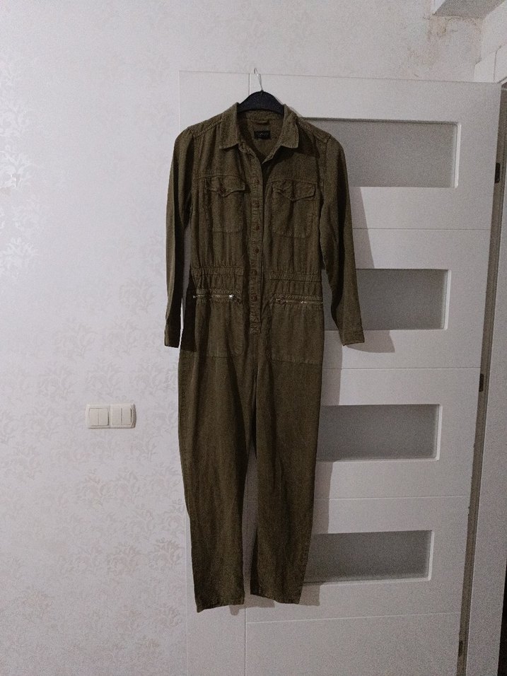 Keten kumaştan yapılmış, kemerli ve uzun kollu kadın tulumu. Notlu yaka tasarımı ve haki yeşil rengiyle günlük sokak stili için uygundur.