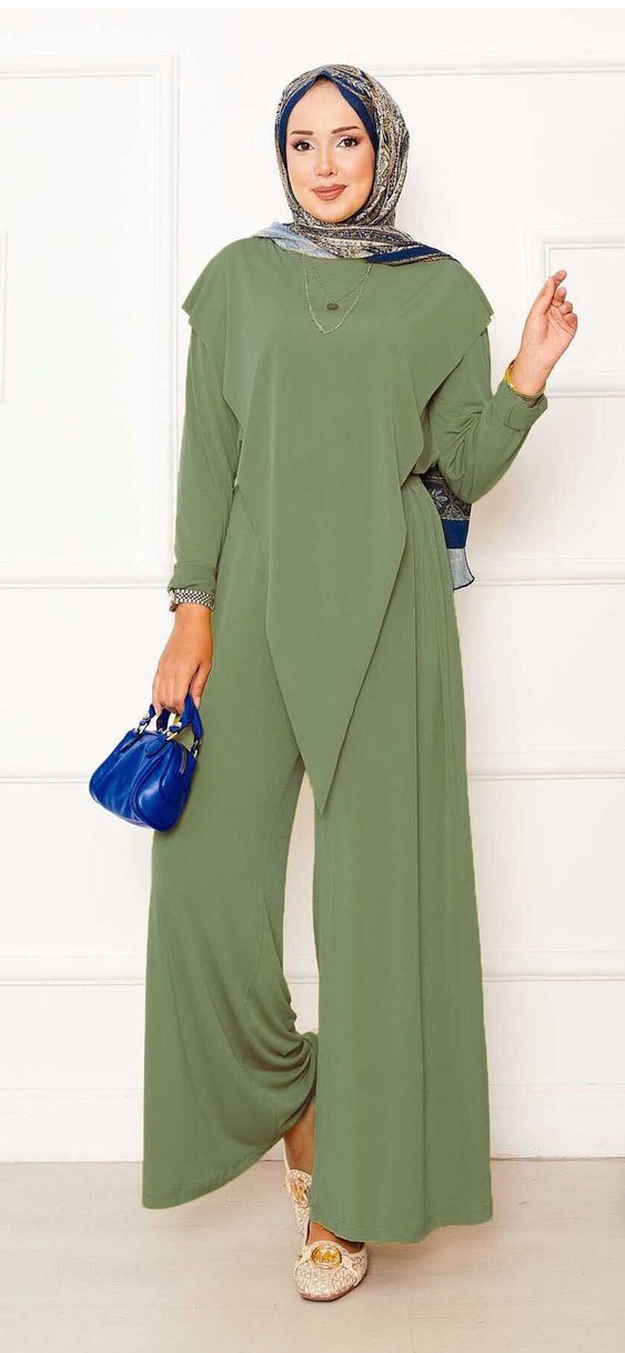 Kadınlar için kemerli, bol kesim, uzun boy ve yüksek yakalı takım. Yumuşak sentetik kumaştan, açık haki renkte, uzun kollu ve günlük kullanım için uygundur.