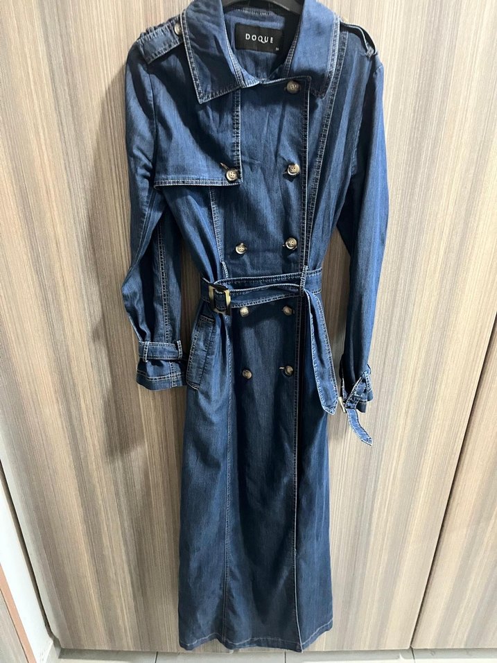 Koyu mavi kot kumaştan, kemerli ve uzun boylu. Notlu yaka ve askılı kollara sahip, rahat kesim sokak stili kot ceket.